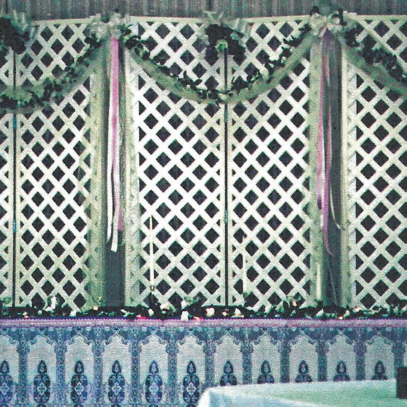 FLOWERS, LATTICE WALLS, ANGEL FOUNTAINS, PILLARS, ARCHWAYS, CANDELABRAS, AND CARD BOXES.